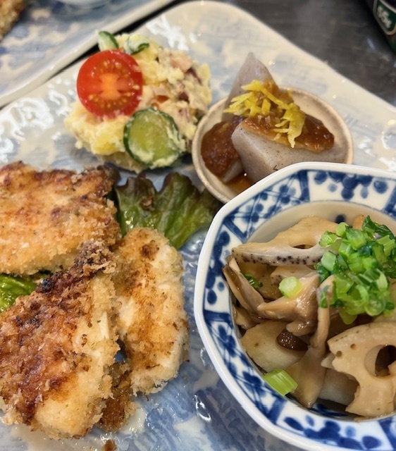鶏肉の青のりパン粉焼き、蓮根と舞茸のきんぴら、さつま芋のポテトサラダ、ゆず味噌こんにゃく、むかごご飯、味噌汁