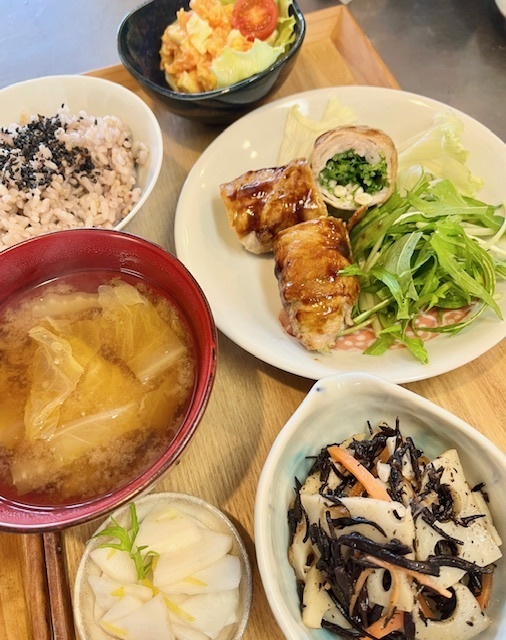 きのこと豆苗の豚バラ巻き、人参卵マヨサラダ、ひじきとちくわの炒め煮、かぶと柚子の甘酢、ご飯、味噌汁
