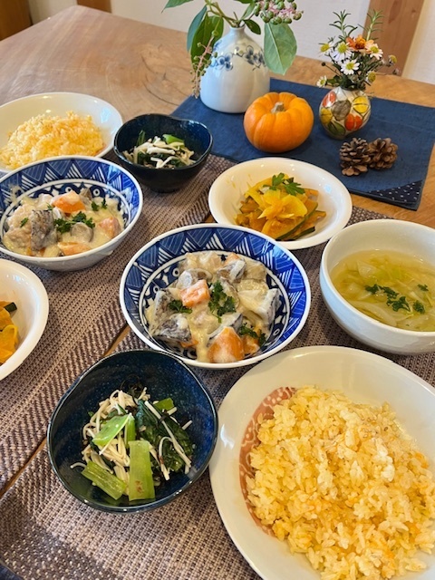 秋鮭のクリーム煮、白菜と厚揚げの煮浸し風、水菜のサラダ、春菊と卵のチャーハン