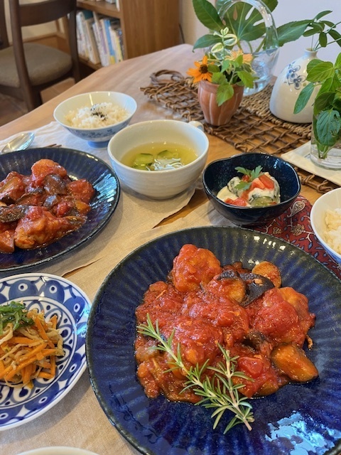 鶏むね肉の青しそバターソテー、茄子と厚揚げのケチャップ煮、人参赤しそ浸し、冷や汁、ご飯