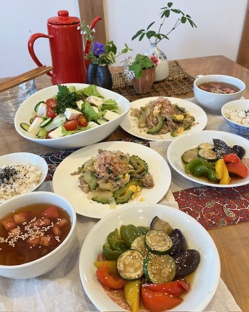ゴーヤチャンプル、夏野菜の彩り揚げ浸し、沖縄風豆腐レタスサラダ、トマトのさっぱり冷やしスープ