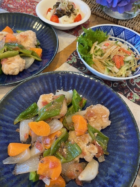 鶏肉と野菜の甘酢あん、韓国風レタスキムチサラダ、薬味豆腐、きゅうりの冷やし汁、枝豆ご飯